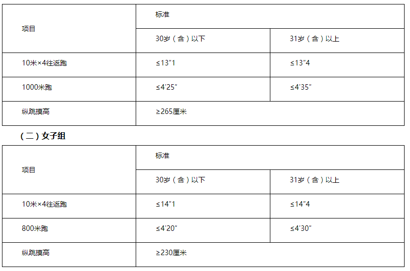 體能測評三項(xiàng)全部達(dá)標(biāo)方為合格。體能測評項(xiàng)目中,縱跳摸高的測試次數(shù)不超過3次,10米×4往返跑的測試次數(shù)不超過2次,長跑項(xiàng)目(男子1000米、女子800米)的測試次數(shù)為1次。