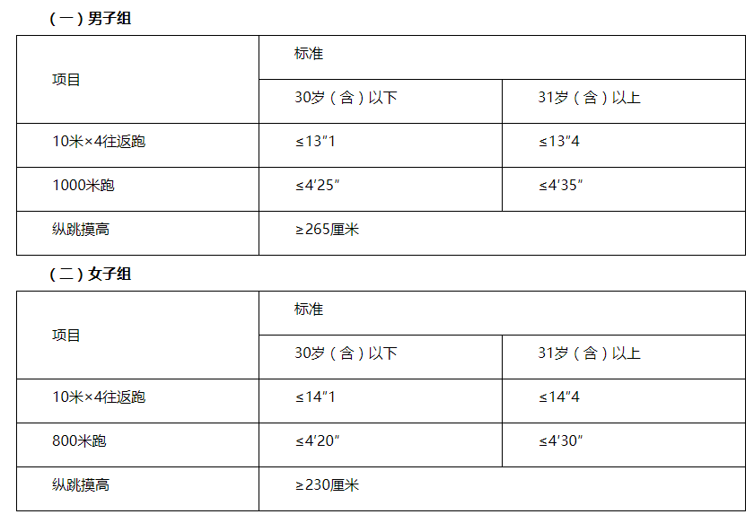 體能測評(píng)項(xiàng)目中,縱跳摸高的測試次數(shù)不超過3次,10米×4往返跑的測試次數(shù)不超過2次,長跑項(xiàng)目(男子1000米、女子800米)的測試次數(shù)為1次。