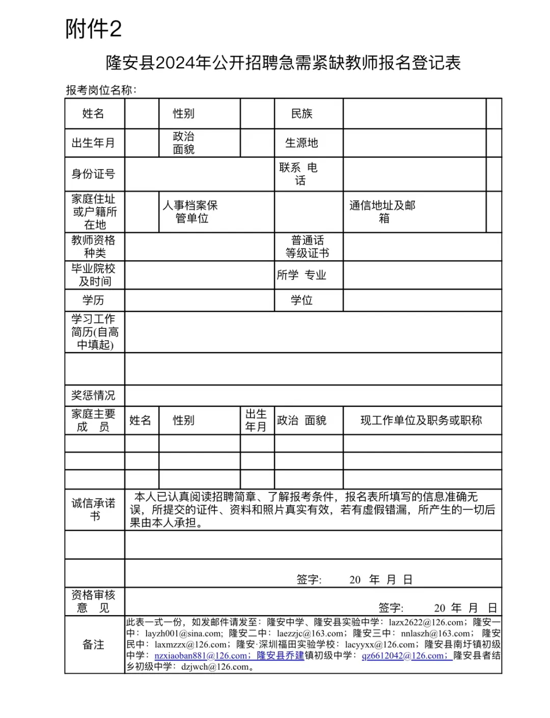 (1)“隆安縣2024年公開招聘急需緊缺教師報(bào)名登記表”電子版。可登錄廣西南寧市人力資源和社會(huì)保障局網(wǎng)站、廣西南寧市隆安縣人民政府門戶網(wǎng)站、隆安縣民族中學(xué)微信公眾號(hào)下載。