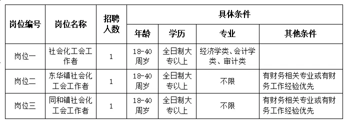 (五)具有全日制大專以上文化程度,年齡18-40周歲,性別不限;崗位一專業(yè)必須為經(jīng)濟(jì)學(xué)類、會(huì)計(jì)學(xué)類、審計(jì)類專業(yè);崗位二、崗位三專業(yè)不限,同等條件下,有財(cái)務(wù)相關(guān)專業(yè)或有財(cái)務(wù)工作經(jīng)驗(yàn)優(yōu)先;