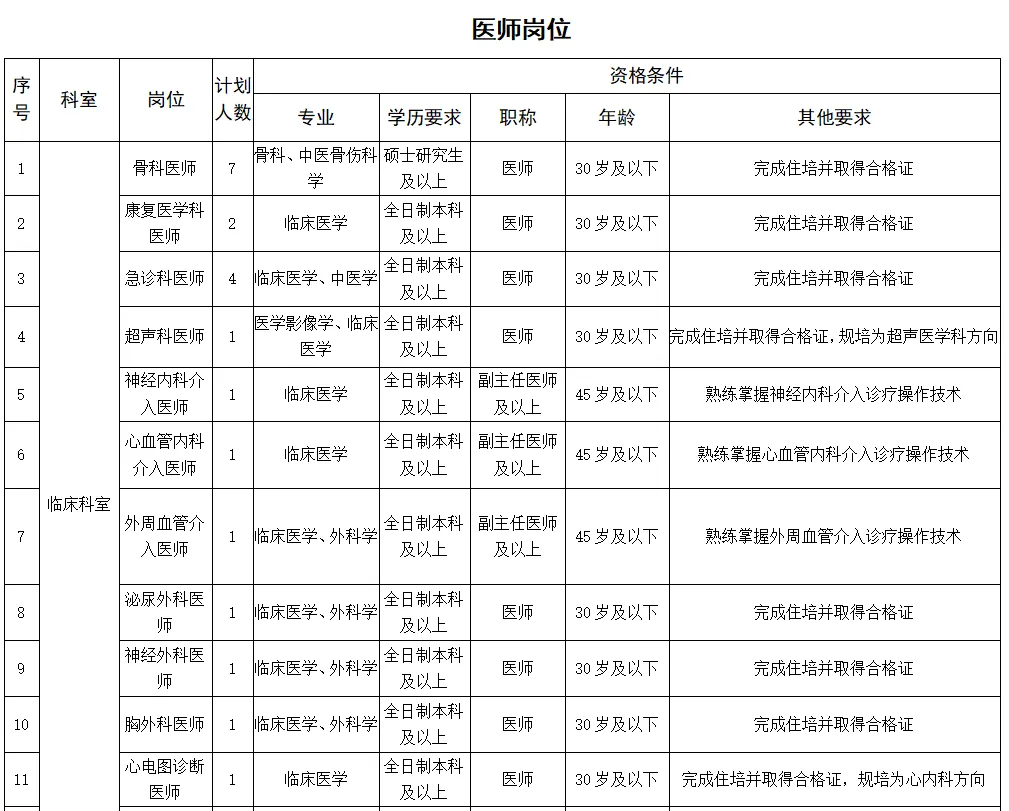 2.條件要求:具備碩士研究生及以上學(xué)歷(部分緊缺專業(yè)可放寬至本科學(xué)歷),年齡不超35歲;專業(yè)理論功底扎實(shí),業(yè)務(wù)技術(shù)過硬,有良好的團(tuán)隊(duì)合作精神;有二級甲等及以上醫(yī)院工作5年及以上經(jīng)歷,并有三級甲等醫(yī)院進(jìn)修6個(gè)月及以上經(jīng)歷。