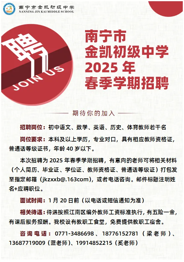 原文標(biāo)題:南寧市金凱初級中學(xué)2025年春季學(xué)期招聘