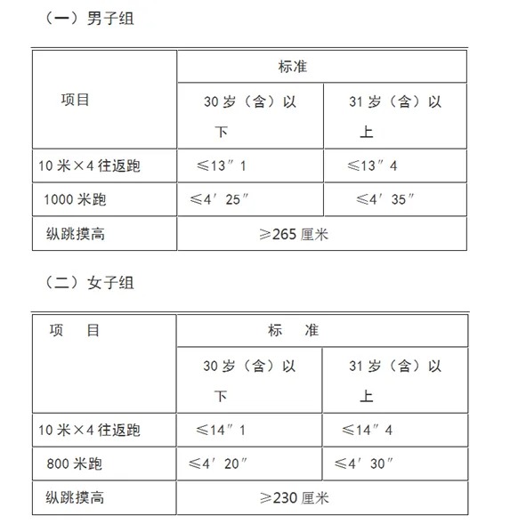 報考人員須參加全部三項體能測評,全部達(dá)標(biāo)方為合格,如放棄一項則視為不合格,體能測評合格的方可進(jìn)入下一環(huán)節(jié)。