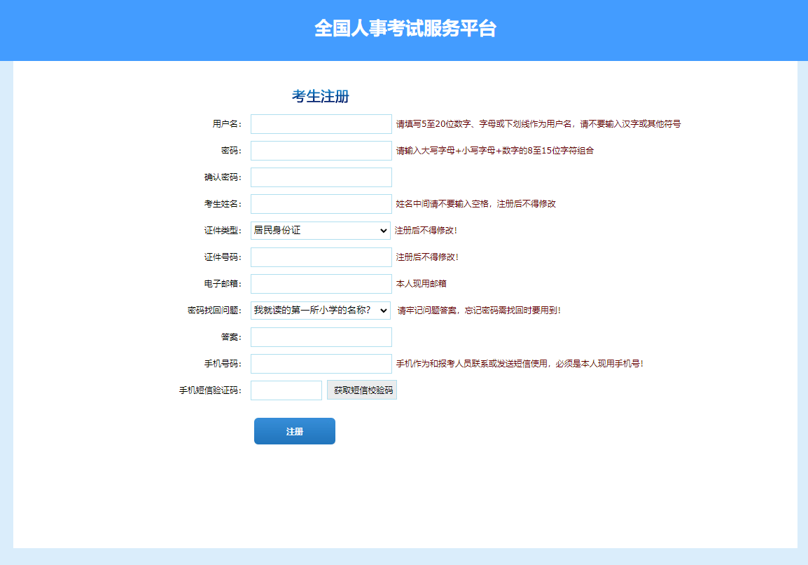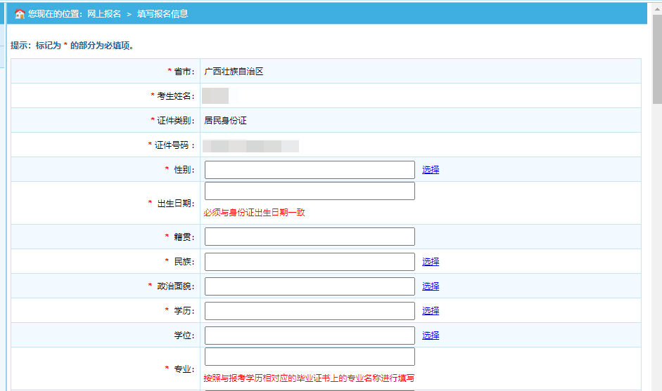 第二步:點擊“注冊”,進入考生注冊頁面,考生注冊填寫個人信息