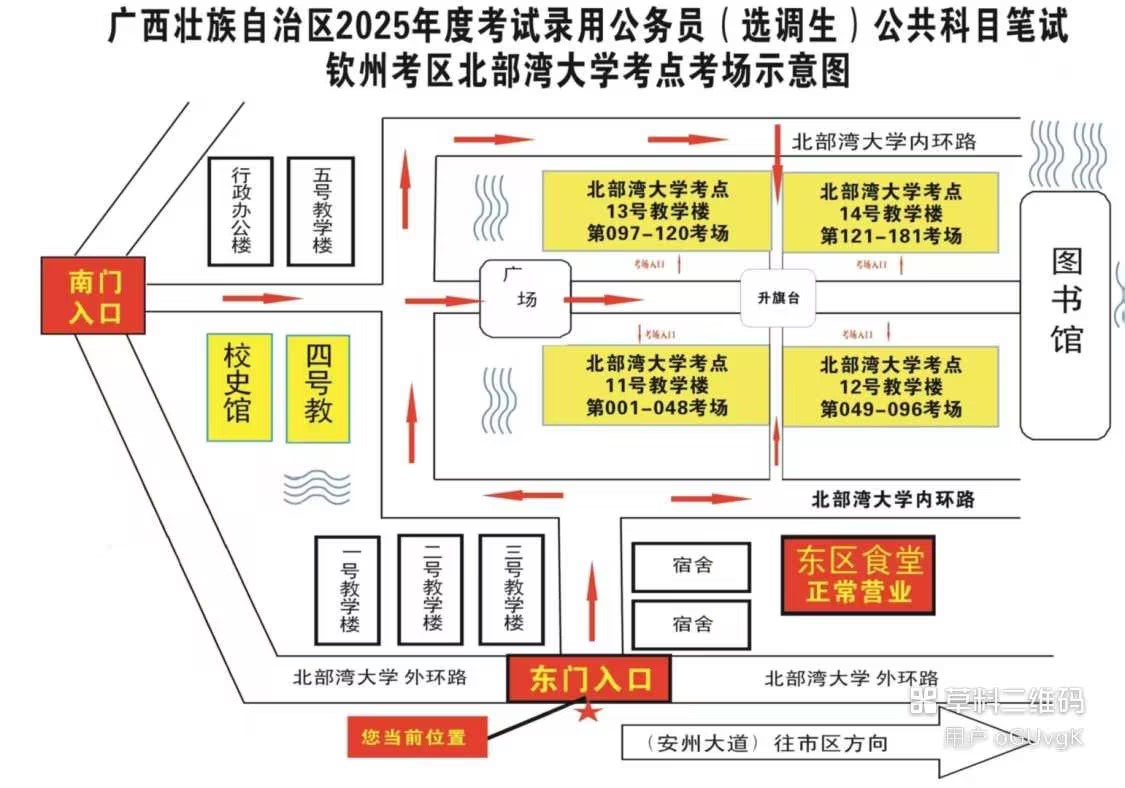 欽州考區(qū)共設兩個考點,分別為北部灣大學考點、北部灣職業(yè)技術學校考點。(考點地址和具體考場安排請掃附后的二維碼查看)