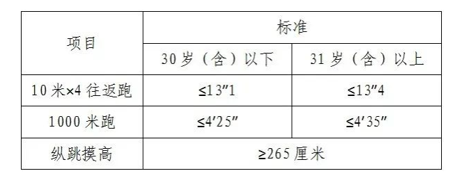 參加者凡有其中一項(xiàng)不達(dá)標(biāo)或放棄,視為體能測評不合格。體能測評合格,方可進(jìn)入下一環(huán)節(jié)。體能測評項(xiàng)目中,縱跳摸高的測評次數(shù)不超過3次,往返跑的測評次數(shù)不超過2次,長跑測評次數(shù)僅為1次。