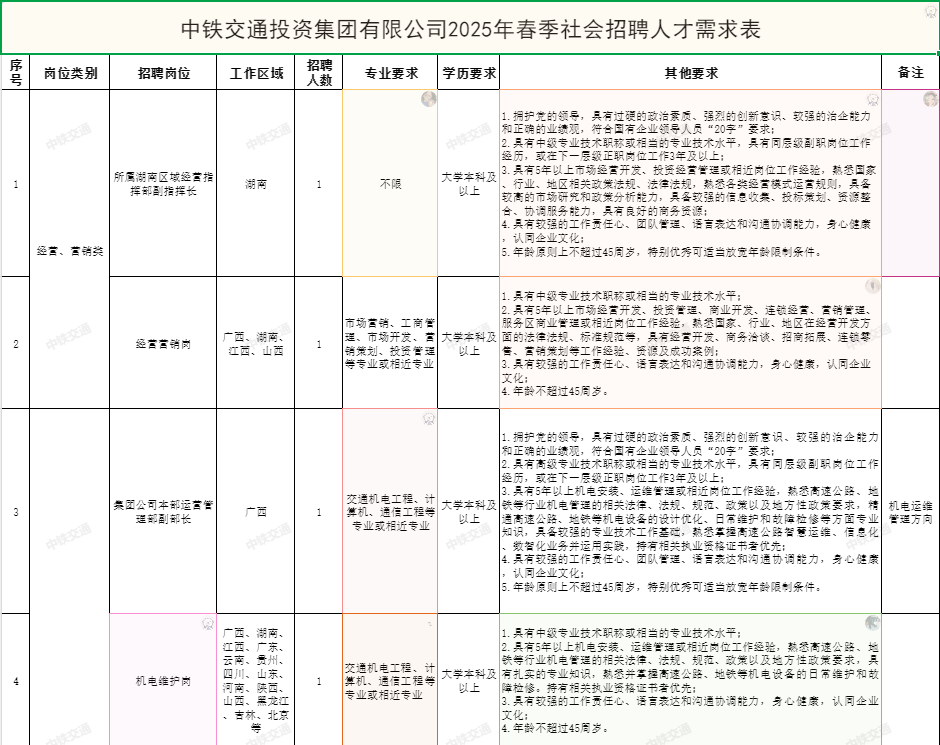附件1:中鐵交通投資集團(tuán)有限公司2025年春季社會招聘人才需求表