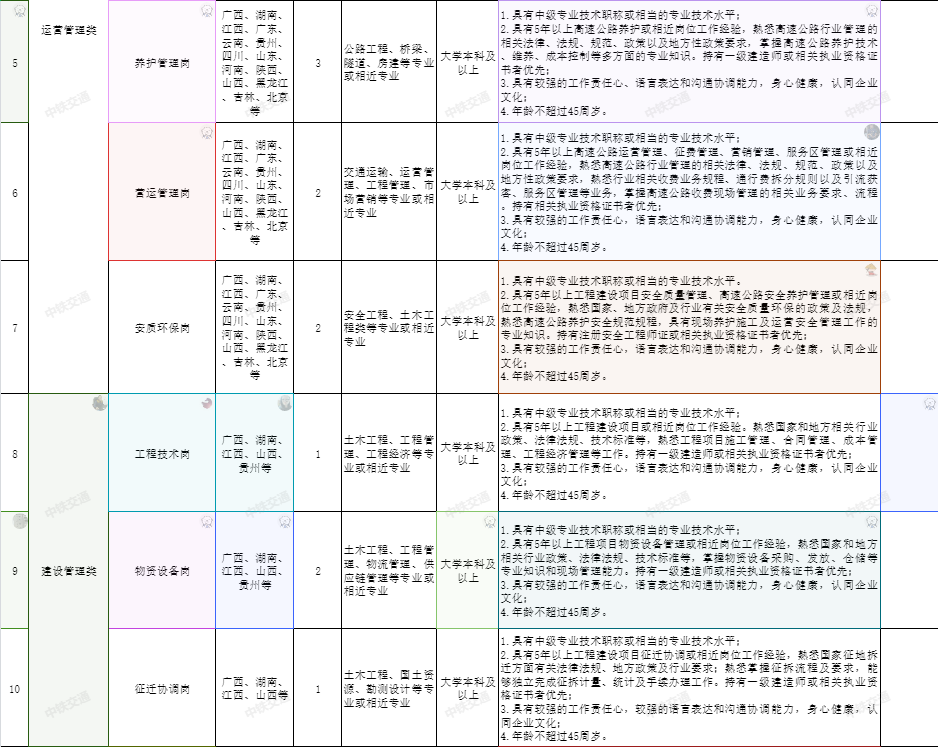 運(yùn)營管理類:集團(tuán)公司本部運(yùn)營管理部副部長;機(jī)電維護(hù)崗;養(yǎng)護(hù)管理崗;營運(yùn)管理崗;安質(zhì)環(huán)保崗