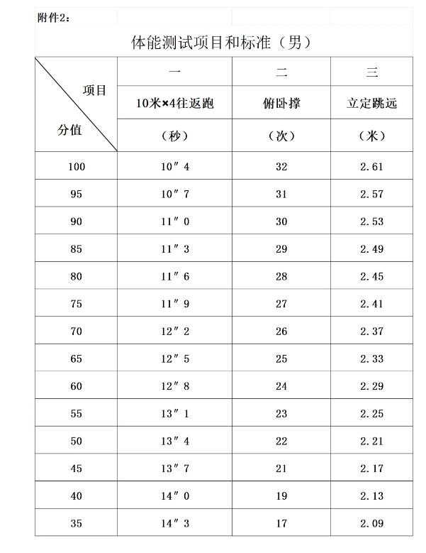 3.體能測試。參照人民警察招錄標(biāo)準執(zhí)行(具體項目和標(biāo)準詳見附件2)。測試項目:10米×4往返跑、立定跳遠、俯臥撐,體能測試三項全部達標(biāo)的,方為合格。