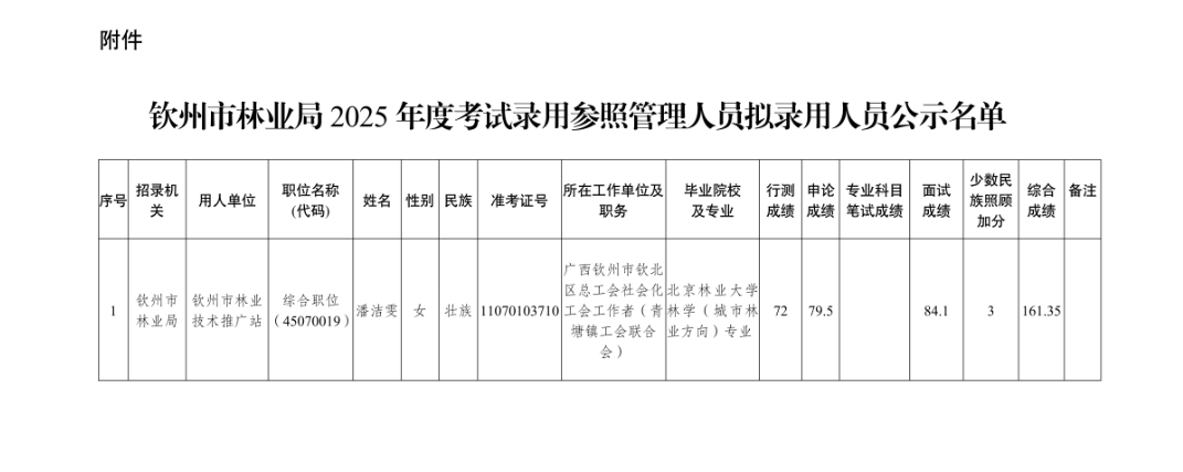 根據(jù)《廣西壯族自治區(qū)2025年度考試錄用公務(wù)員公告》等有關(guān)規(guī)定,我單位2025年計(jì)劃招錄1名參照管理人員,經(jīng)過公開報(bào)名、資格審查、筆試、面試、體檢、考察等程序,擬錄用潘潔雯同志(附件)為參照管理人員,現(xiàn)予以公示。公示期5個工作日,如對擬錄用人員的錄用資格有異議,請?jiān)诠酒趦?nèi)向欽州市林業(yè)局辦公室實(shí)名反映。