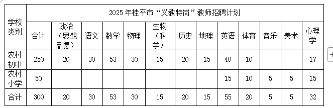 經(jīng)自治區(qū)教育廳、黨委編辦、財(cái)政廳、人社廳批準(zhǔn),2025年桂平市“義教特崗”教師招聘計(jì)劃共300名,其中初中250名、小學(xué)50名。詳情見下表: