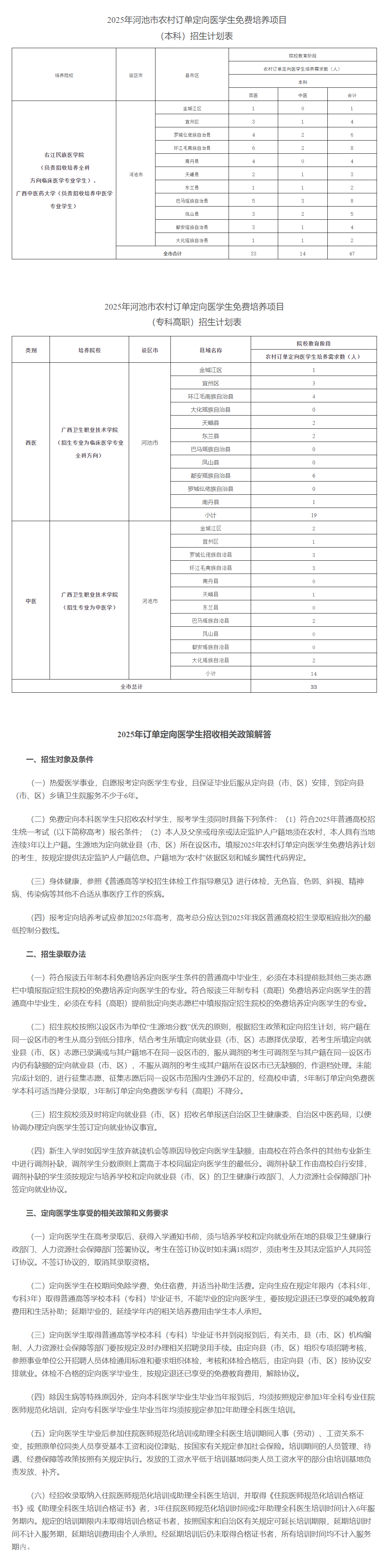 2025年,廣西繼續(xù)實(shí)施定向醫(yī)學(xué)生免費(fèi)培養(yǎng)項(xiàng)目,面向全區(qū)招生。河池市共有80個(gè)名額,其中,本科47個(gè),專(zhuān)科33個(gè),培養(yǎng)院校分別為:右江民族醫(yī)學(xué)院、廣西中醫(yī)藥大學(xué)、廣西衛(wèi)生職業(yè)技術(shù)學(xué)院,培養(yǎng)專(zhuān)業(yè)為臨床醫(yī)學(xué)和中醫(yī)學(xué)。