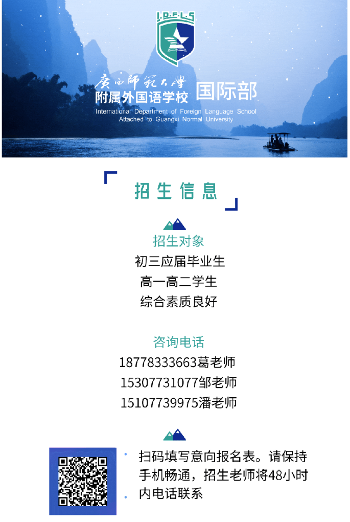 廣西師范大學(xué)附屬外國(guó)語(yǔ)學(xué)校位于以山水之美聞名世界的桂林市,教育教學(xué)成績(jī)斐然。其國(guó)際部是廣西壯族自治區(qū)最早批準(zhǔn)成立的國(guó)際部,自2011年成立以來(lái),積極引進(jìn)國(guó)外先進(jìn)教育理念,整合師大附外的優(yōu)質(zhì)基礎(chǔ)教育資源,堅(jiān)持社會(huì)主義核心價(jià)值觀為導(dǎo)向,培養(yǎng)具有崇高理想、愛(ài)國(guó)信念和突出跨文化交際能力的社會(huì)主義新型人才。