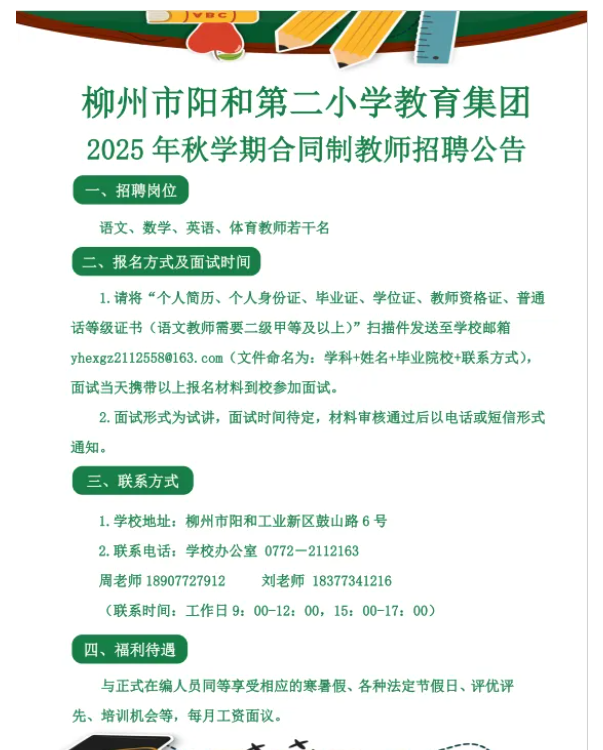 原文標(biāo)題:柳州市陽和第二小學(xué)教育集團2025年秋學(xué)期合同制教師招聘公告