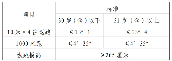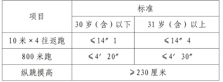 體能測評項目中,縱跳摸高的測試次數(shù)不超過3次,10米×4往返跑測評次數(shù)為2次,1000米/800米的測評次數(shù)均為1次。應(yīng)聘勤務(wù)崗位的人員,體能測評三項全部達標的方為合格;應(yīng)聘文職崗位的人員,體能測評三項有兩項達標的,視為合格。