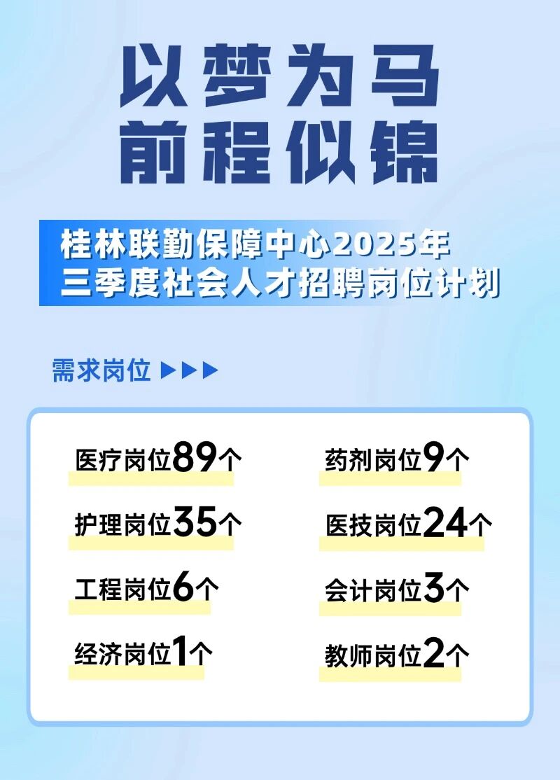 桂林聯勤保障中心2025年三季度社會人才招聘崗位計劃169個。