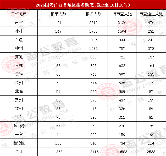 今天是報(bào)名第二天,小伙伴可要抓住此次上/岸機(jī)會(huì)啦!來(lái)看看廣西今天的報(bào)名數(shù)據(jù)吧。截止10月16日下午16:00,已經(jīng)有13116名考生報(bào)名,最熱崗220人報(bào)名!從各項(xiàng)數(shù)據(jù)來(lái)看,部分考生可能還持觀望態(tài)度。在接下來(lái)的報(bào)名時(shí)間里,可能會(huì)迎來(lái)報(bào)名人數(shù)大幅增長(zhǎng)的情況,大家可以密切關(guān)注。