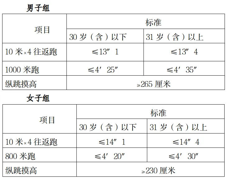 參照《關于印發(fā)<公安機關錄用人民警察體能測評項目和標準>的通知》(公政治〔2024〕60號)執(zhí)行,每個測評項目分別記錄成績。其中縱跳摸高的測評次數(shù)不超過3次,10米×4往返跑測評次數(shù)不超過2次,男子1000米跑、女子800米跑測評次數(shù)均為1次。